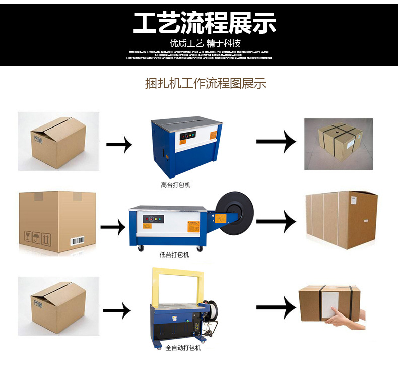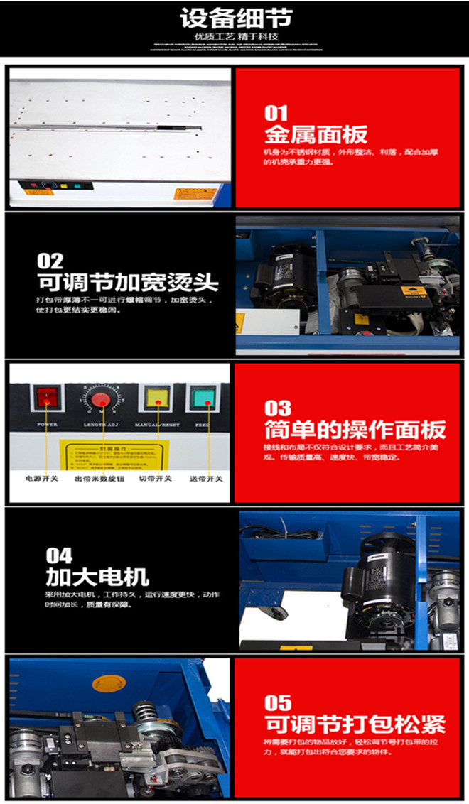 打包机是以聚乙烯塑料带为捆扎材料,主要用于商业、邮政、铁路、银行、食品、医药、书刊发行等行业的纸箱、纸包件、柳编箱、布包件的包装捆扎。