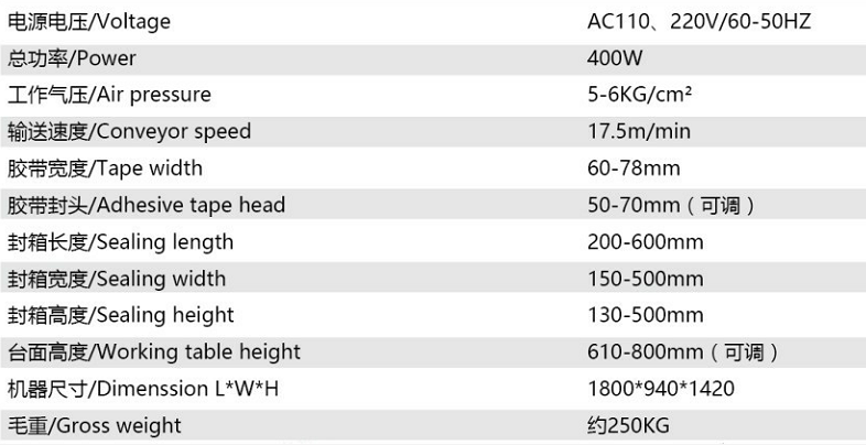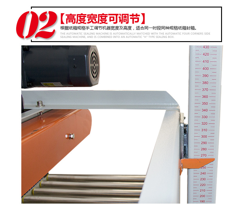 2、封箱机根据纸箱规格,手工调节宽度及高度