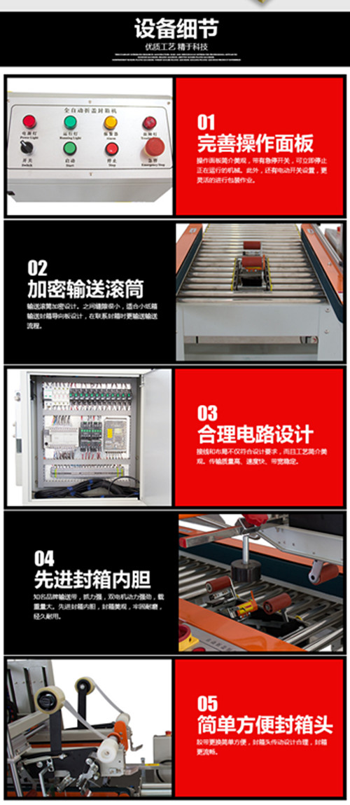 1、自动折盖封箱机采用国际先进技术制造,并选用进口零部件,电器元件